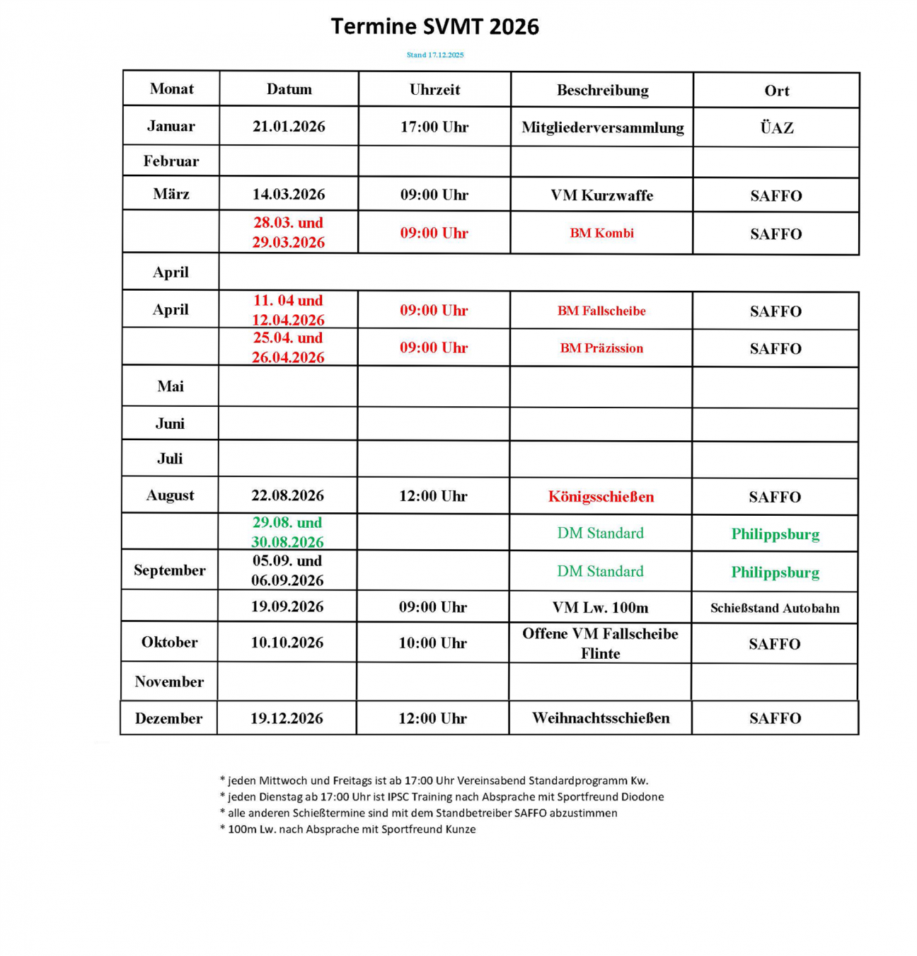 wir haben auf unserer Mitgliederversammlung beschlossen einen zusätzlichen Tag pro Woche für das sportliche Schießen anzubieten. Dieser zusätzliche Termin wird jeden Freitag von 17:00 Uhr bis 22:00 Uhr angeboten. Wir wollen damit erreichen, dass Mittwochs nicht zu viele Schützen zu lange auf ihre Trainingszeit warten müssen.